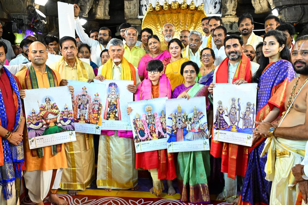Vedic priests conducted chanting ceremonies and offered special blessings to CM Chandrababu Naidu’s family. During the event, the TTD calendar and diary were inaugurated. Later, as part of the Brahmotsavam celebrations, the family also paid respects to Sri Malayappa Swamy seated on the grand Pedda Sesha Vahanam.